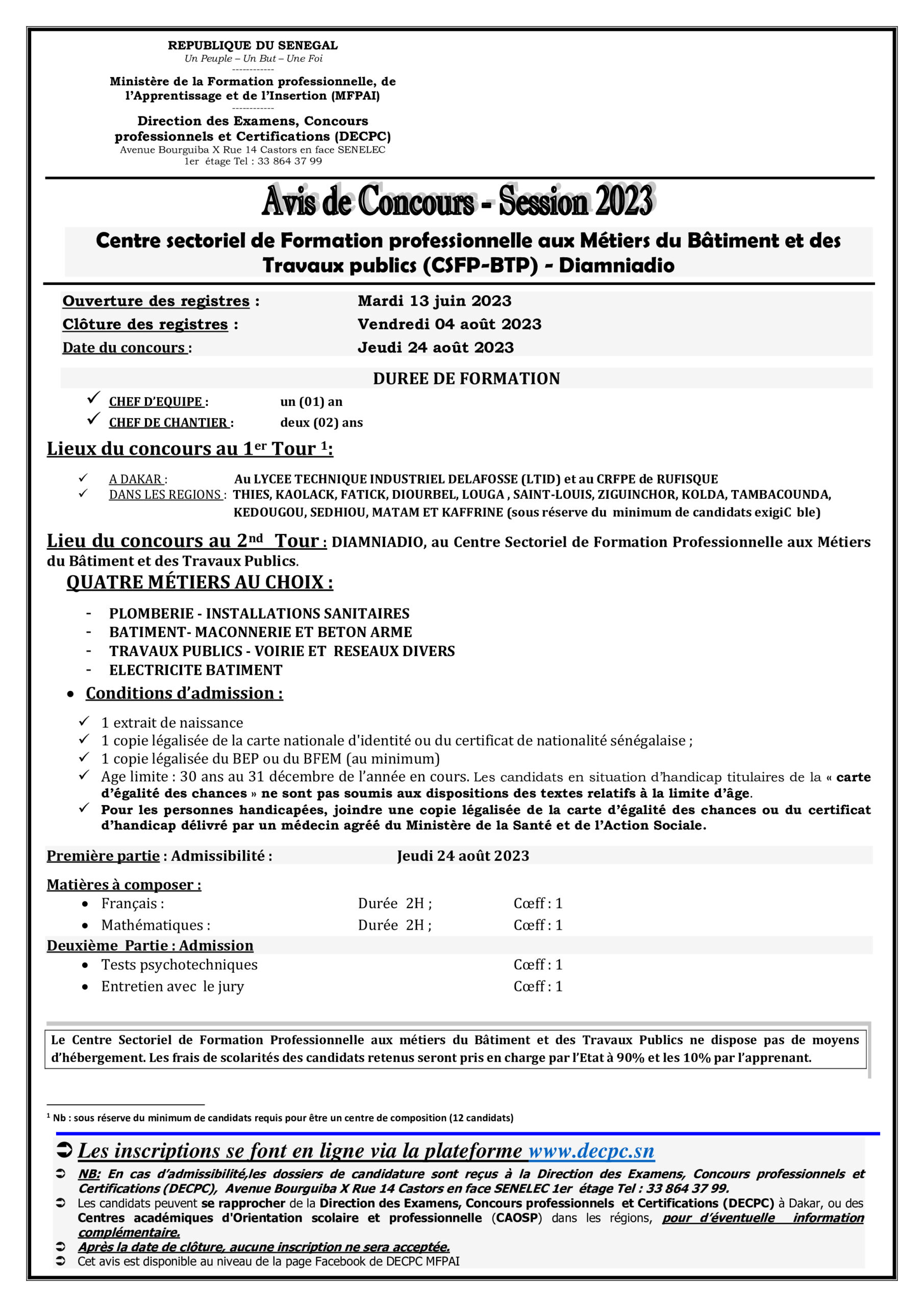 19. CONCOURS 2023 PLOMBERIE – INSTALLATIONS SANITAIRES – BATIMENT- MACONNERIE ET BETON ARME – TRAVAUX PUBLICS – VOIRIE ET RESEAUX DIVERS – ELECTRICITE BATIMENT