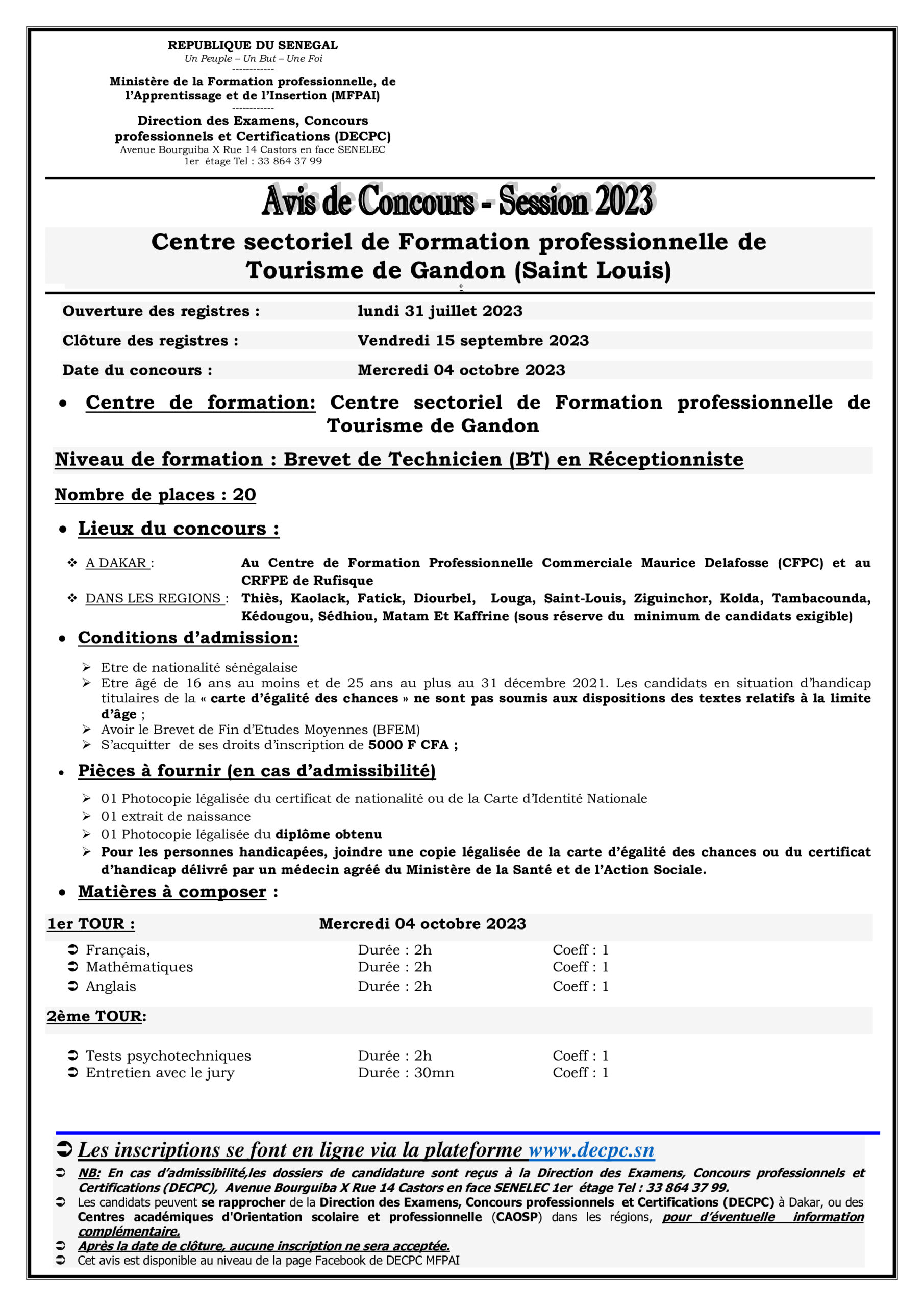 30. CONCOURS BREVET DE TECHNICIEN EN RECEPTIONNISTE