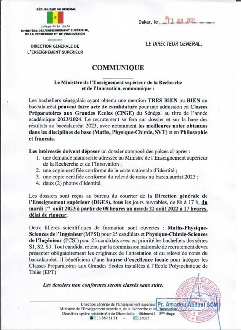 Admission des nouveaux bacheliers en Classes Préparatoires aux Grandes Ecoles (CPGE) du Sénégal au titre de l’année académique 2023/2024