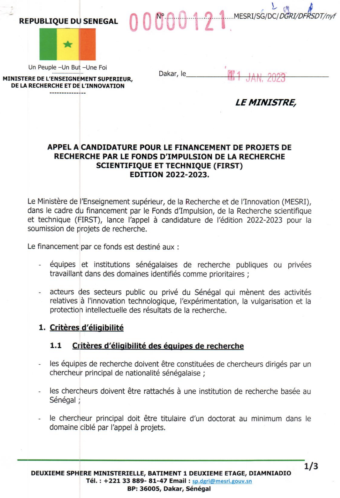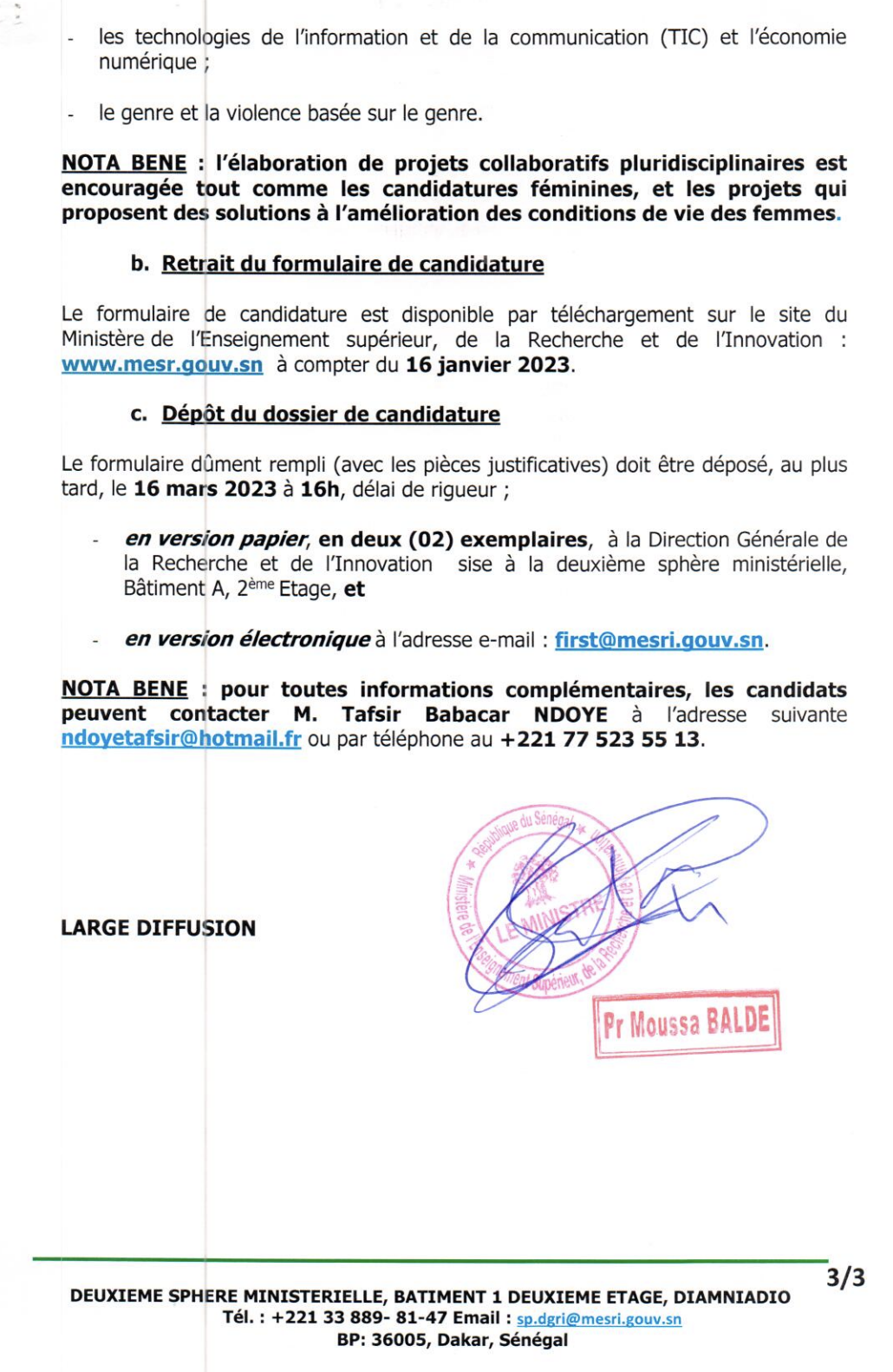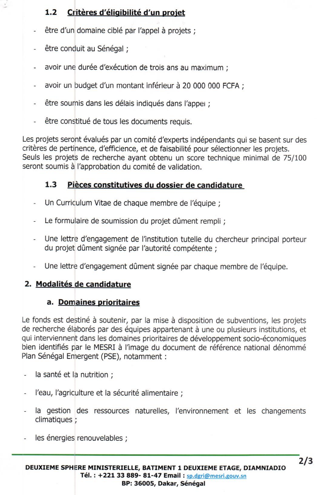 • en version électronique à l’adresse e-mail : first@mesri.gouv.sn.