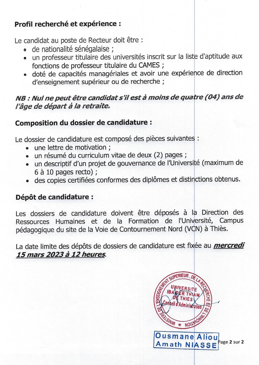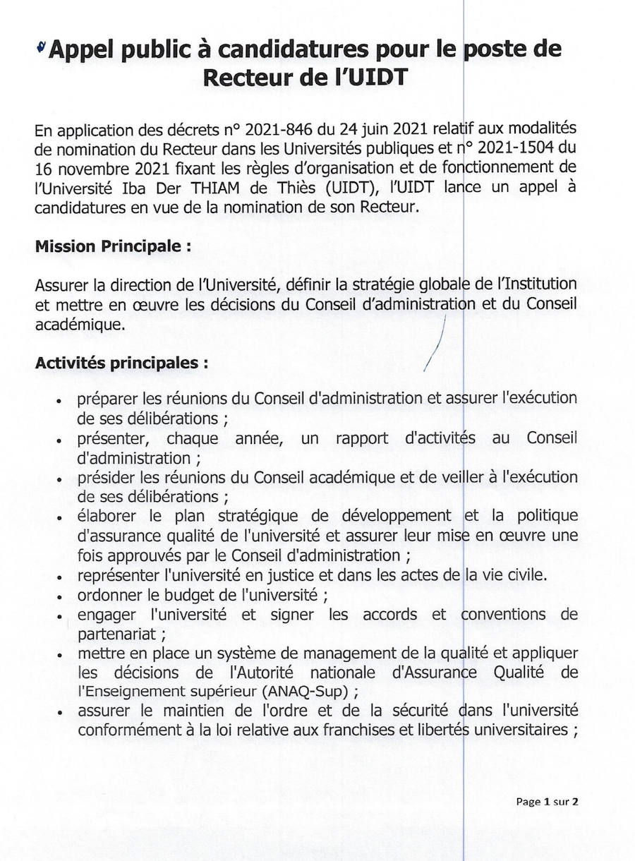 Appel public à candidatures pour le poste de Recteur de l’Université Iba Der Thiam de Thiès