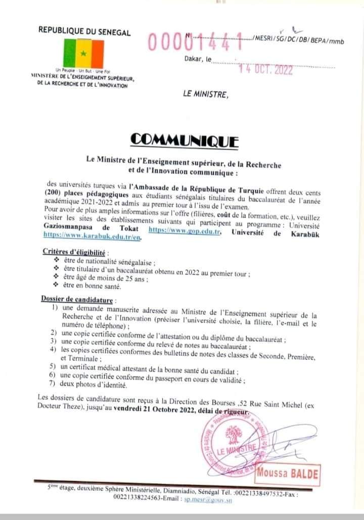 Avis aux nouveaux bacheliers de 2021-2022, Bourses turques.