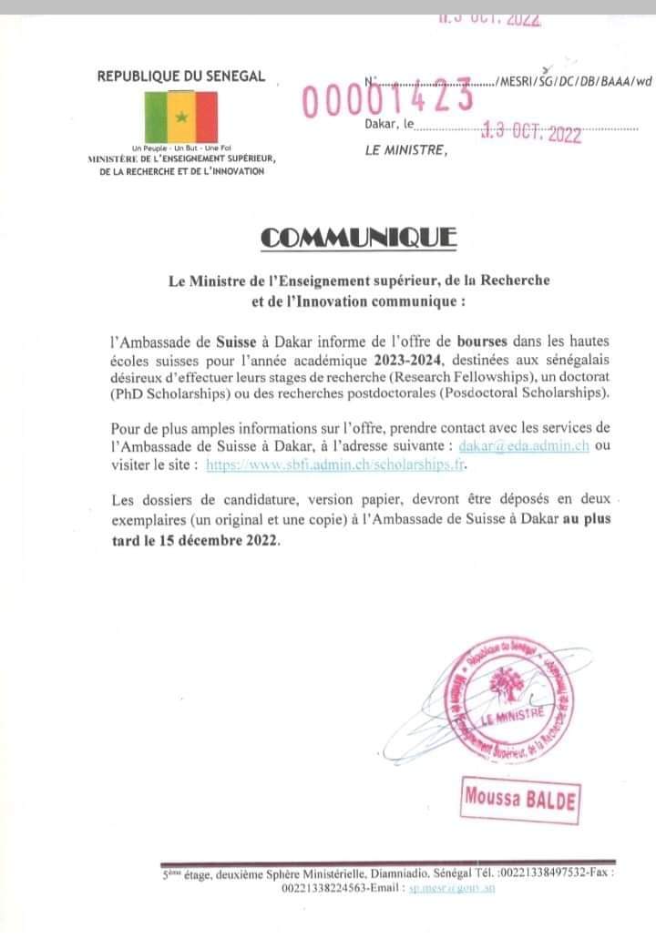 Avis aux sénégalais désireux d’effectuer leurs stages de recherche dans les hautes écoles suisses pour l’année académique 2023-2024
