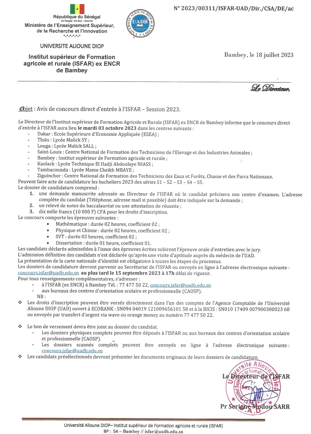 Avis de concours direct d’entrée à l’ISFAR – Session 2023