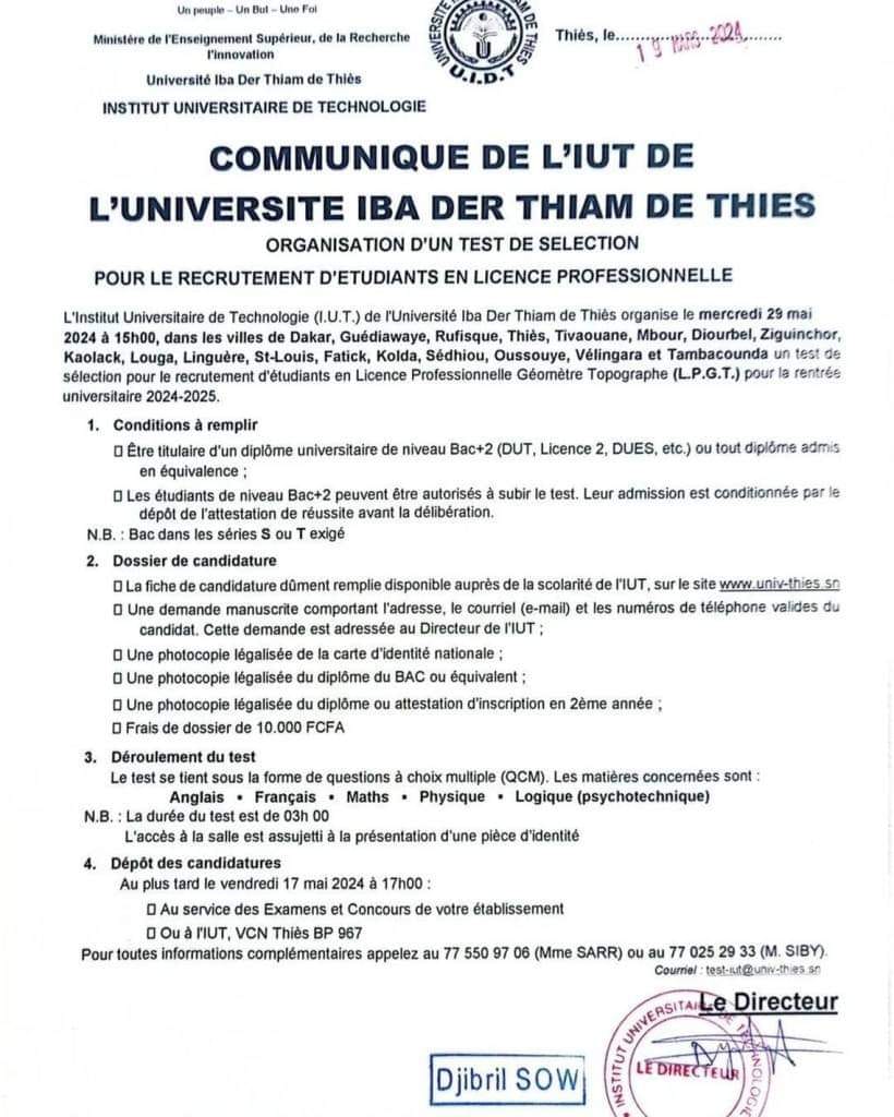 L’Institut Universitaire de Technologie (I.U.T.) de l’Université Iba Der Thiam de Thiès organise le mercredi 29 mai 2024 à 15h00, un test de sélection pour le recrutement d’étudiants en Licence Professionnelle Géomètre-Topographe (L.P.G.T.), dans les villes suivantes : Dakar, Guédiawaye, Rufisque, Thiès, Tivaouane, Mbour, Diourbel, Ziguinchor, Kaolack, Louga, Linguère, St-Louis, Fatick, Kolda, Sédhiou, Oussouye, Vélingara et Tambacounda, en vue de la rentrée universitaire 2024-2025.