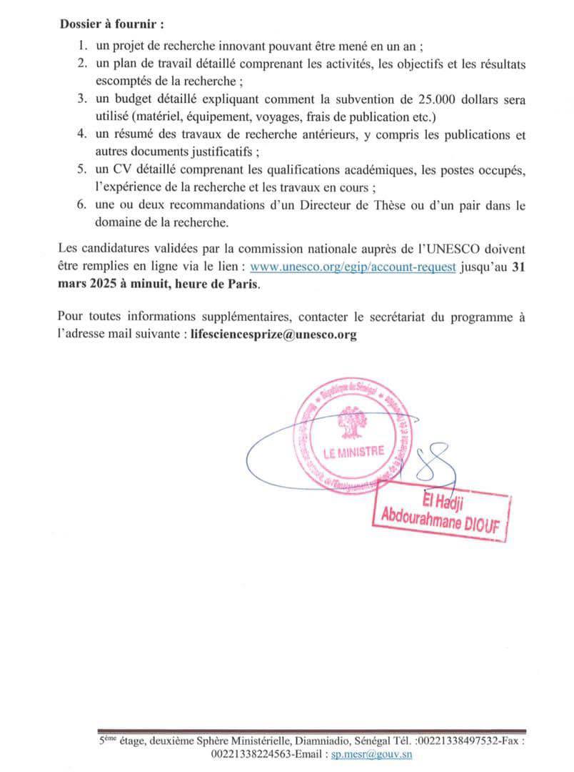 - Être de nationalité sénégalaise et mener des travaux de recherche dans un laboratoire reconnu en Afrique ;