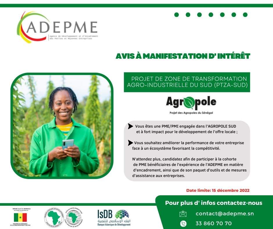 Cet Appel à Manifestation d’Intérêt entre dans le cadre de la mise en œuvre du Projet de Zone de Transformation Agro-Industrielle du Sud (PTZA-SUD) dénommé (Projet Agropole SUD) financé par la Banque africaine de Développement (BAD) et la Banque Islamique de Développement/BID) et mise en œuvre par l’Agence de Développement et d’Encadrement des Petites et Moyennes Entreprises (ADEPME).