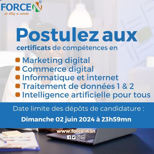 Appel à Candidature : Programme Force-N Sénégal – 5 Certificats Gratuits pour le Renforcement de vos Compétences Numériques