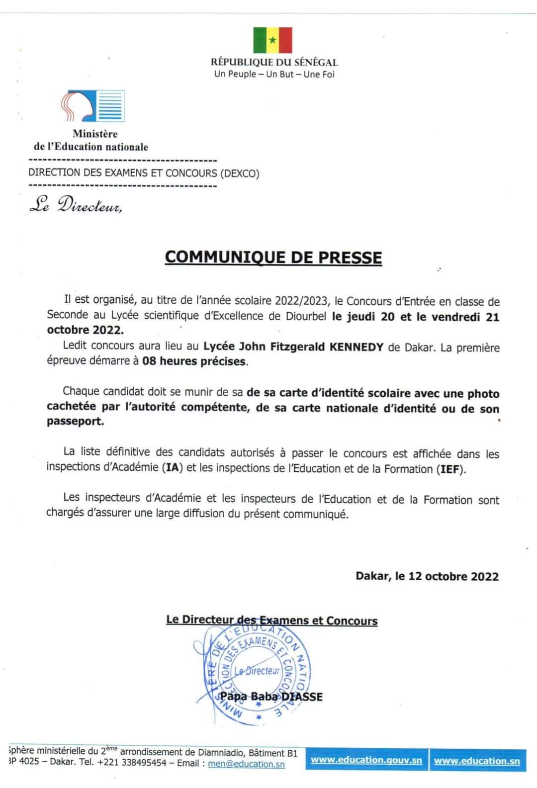 Communiqué de presse du Concours d’Entrée au Lycée scientifique d’Excellence de Diourbel (LSED)