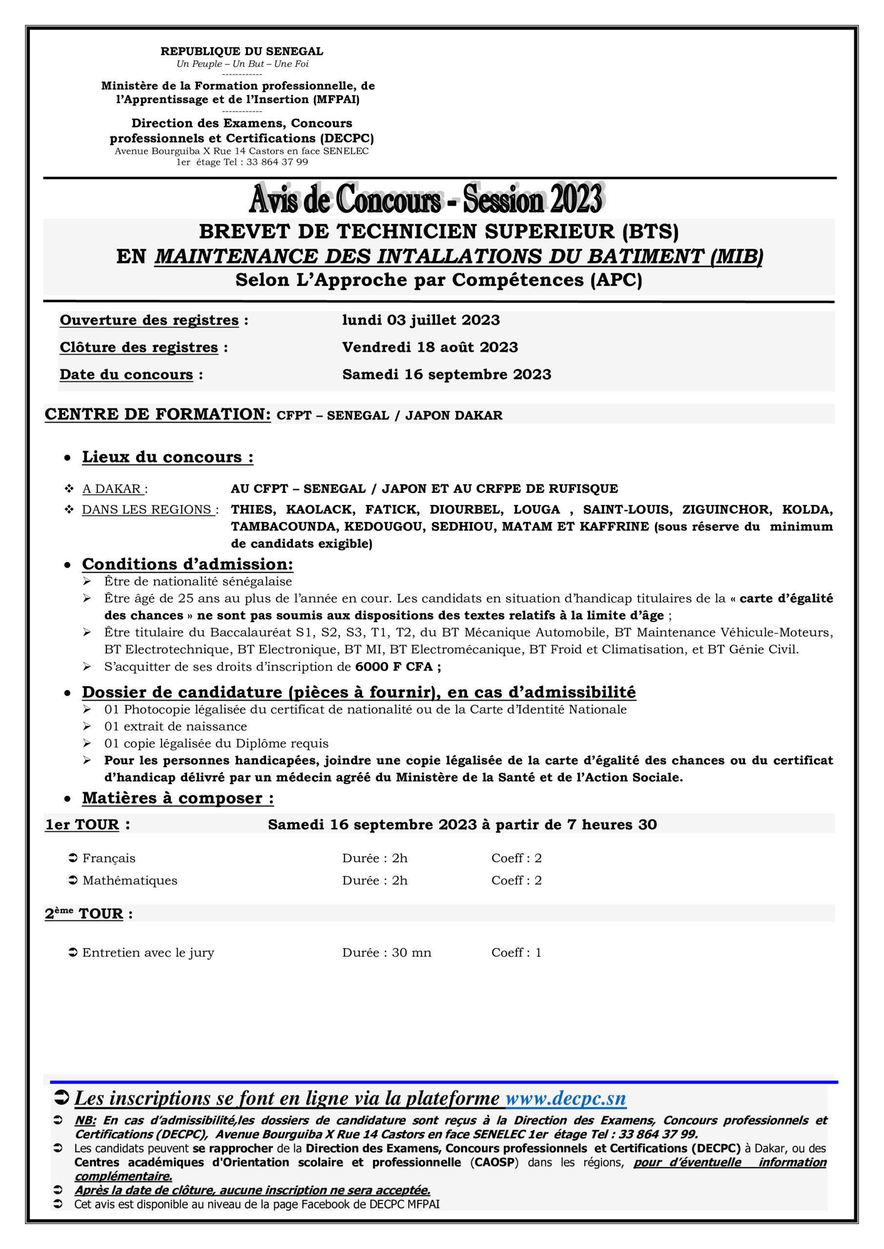 3. CONCOURS 2023 BREVET DE TECHNICIEN SUPERIEUR (BTS) EN MAINTENANCE DES INTALLATIONS DU BATIMENT (MIB)