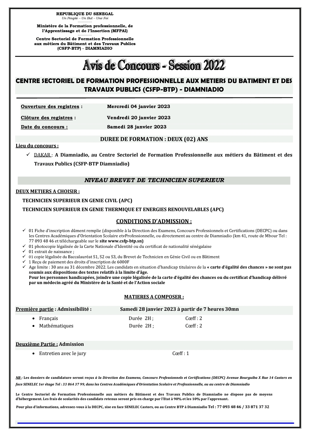 Concours Centre Sectoriel de la formation professionnelle aux métiers du bâtiment et des travaux publics (CSFP-BTP) – Diamniadio
