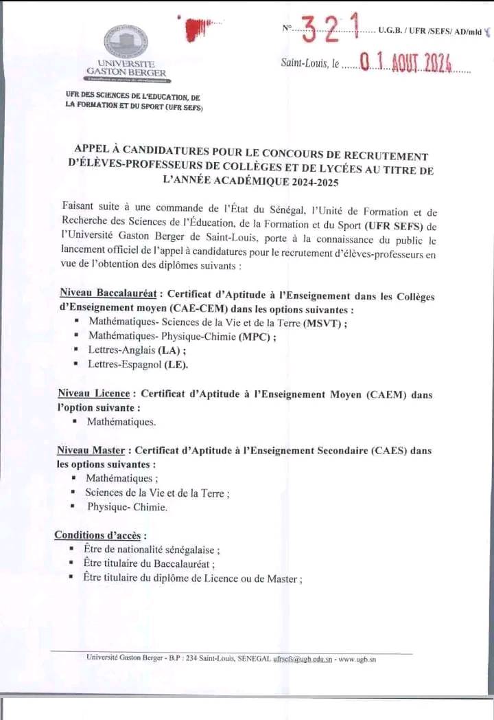 Faisant suite à une commande de l’État du Sénégal, l’Unité de Formation et de Recherche des Sciences de l’Éducation, de la Formation et du Sport (UFR SEFS) de l’Université Gaston Berger de Saint-Louis, porte à la connaissance du public le lancement officiel de l’appel à candidatures pour le recrutement d’élèves-professeurs en vue de l’obtention des diplômes suivants :