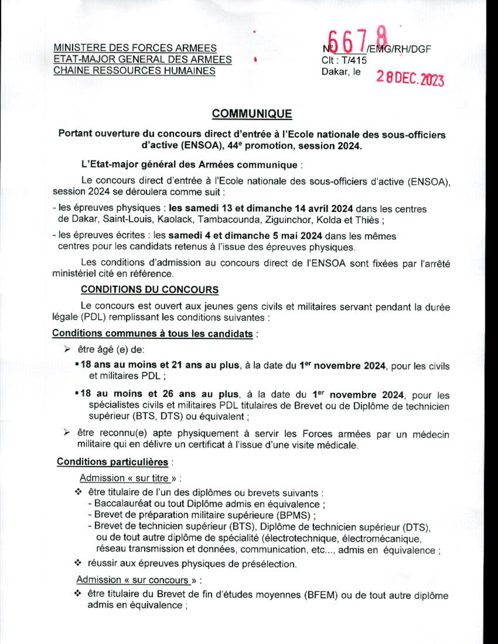 ÉCOLE NATIONALE DES SOUS-OFFICIERS D’ACTIVE (ENSOA) – CONCOURS D’ENTRÉE, 44e PROMOTION, SESSION 2024