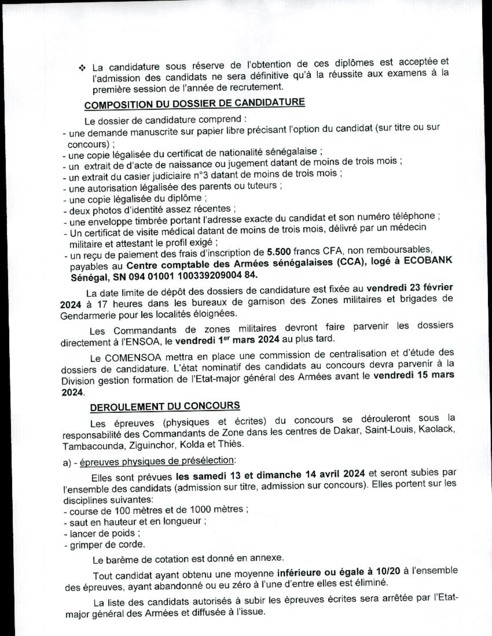 Date Limite de Dépôt des Dossiers : Vendredi 23 février 2024, 17 heures, bureaux de garnison des Zones militaires et brigades de Gendarmerie (pour localités éloignées).