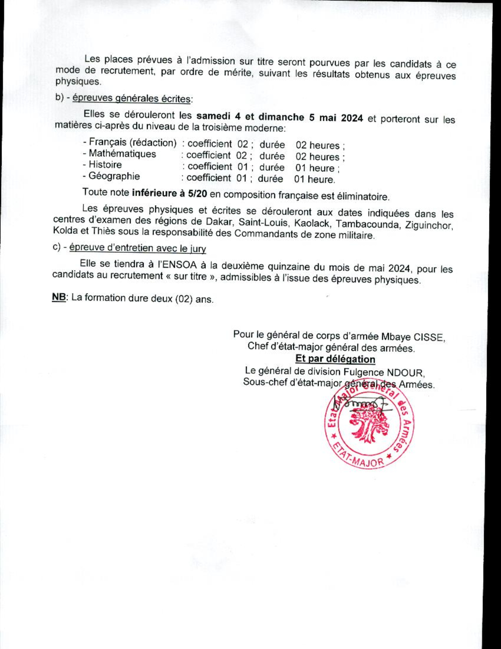 L’État-Major Général des Armées informe l’opinion publique de l’ouverture du concours direct d’entrée à l’École Nationale des Sous-Officiers d’Active (ENSOA), 44e promotion, session 2024.