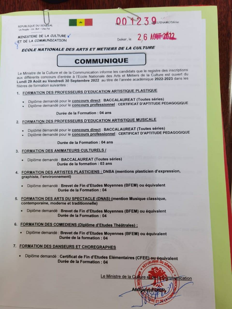 NB : Les diplômes de l’Ecole Nationale des Arts ne donnent pas droit à l’accès automatique à la Fonction Publique.