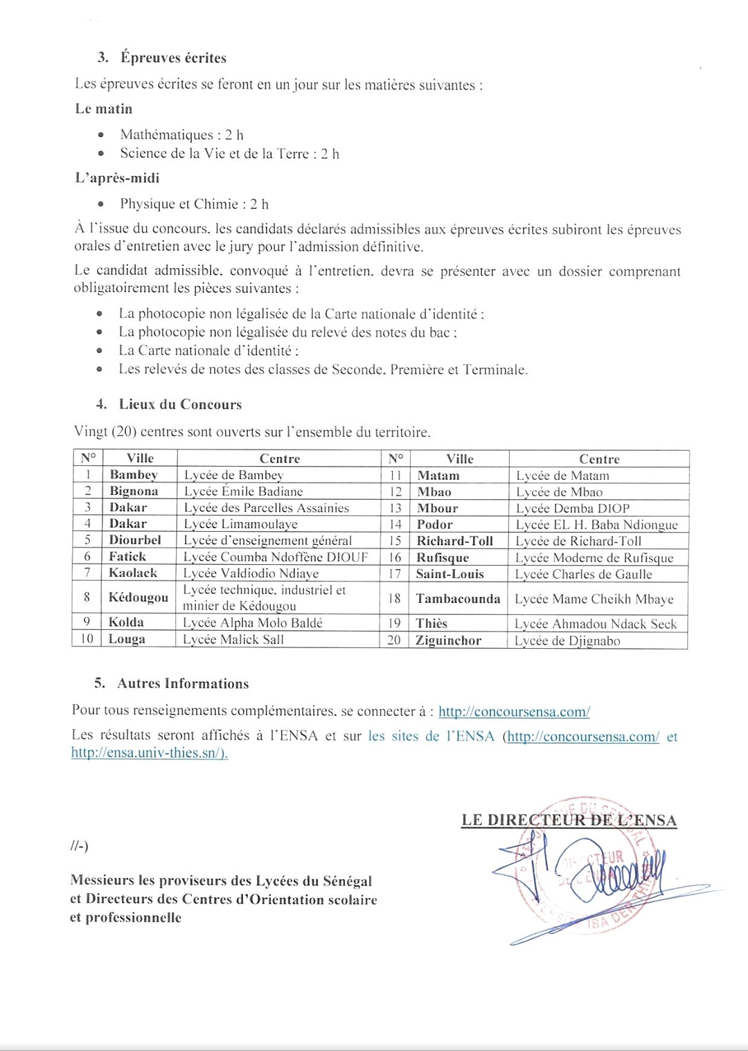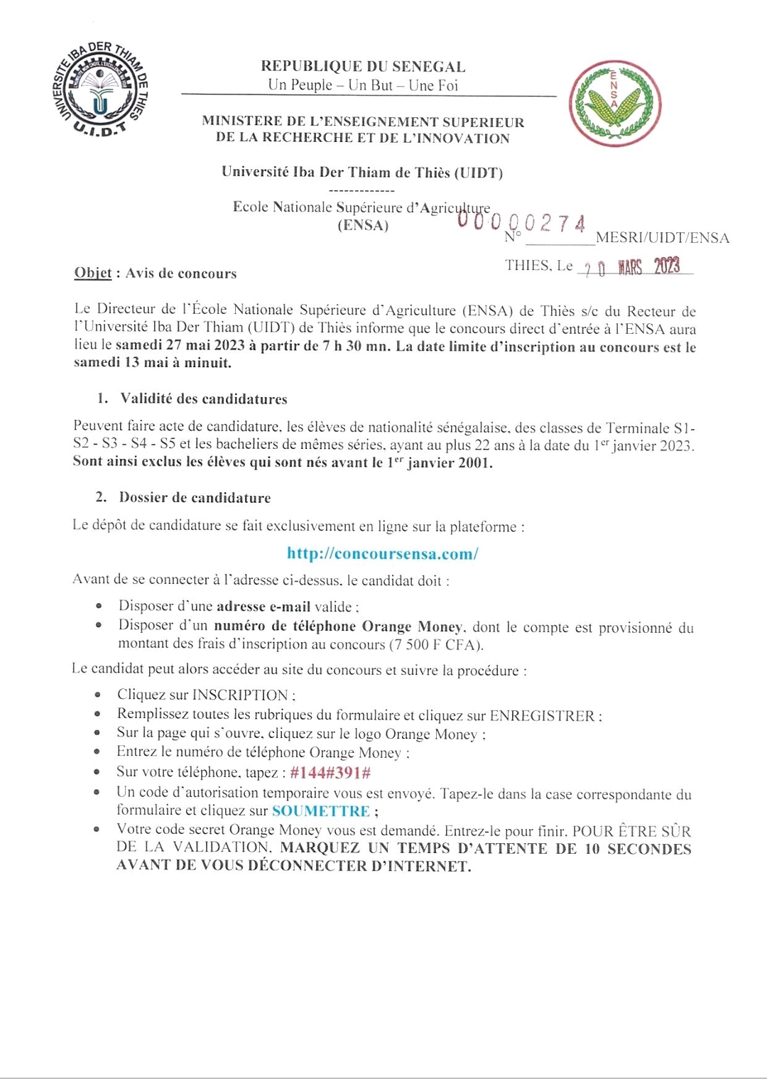 Concours d’entrée à l’École nationale supérieure d’Agriculture (ENSA), Session 2023