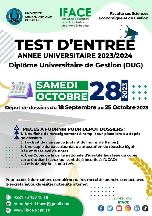 Vous êtes bacheliers, étudiants ou professionnels, l’Institut de Formation en Administration et Création d’entreprise (IFACE) vous propose une formation en gestion des entreprises accessible par un concours d’entrée avec une exemption des frais de scolarité et une possibilité d’avoir une bourse de l’état.