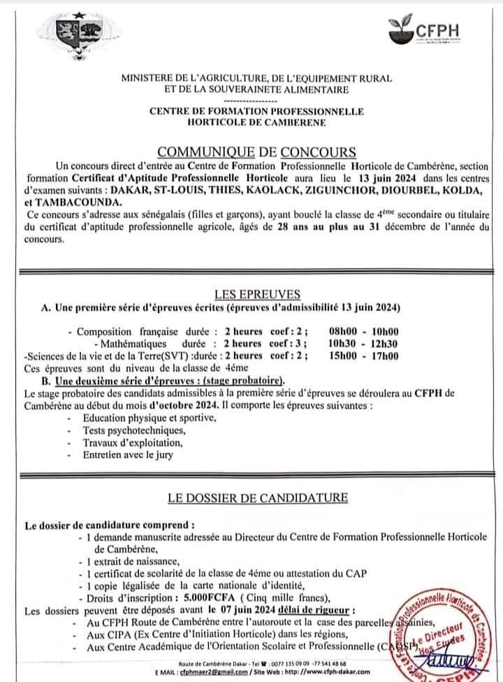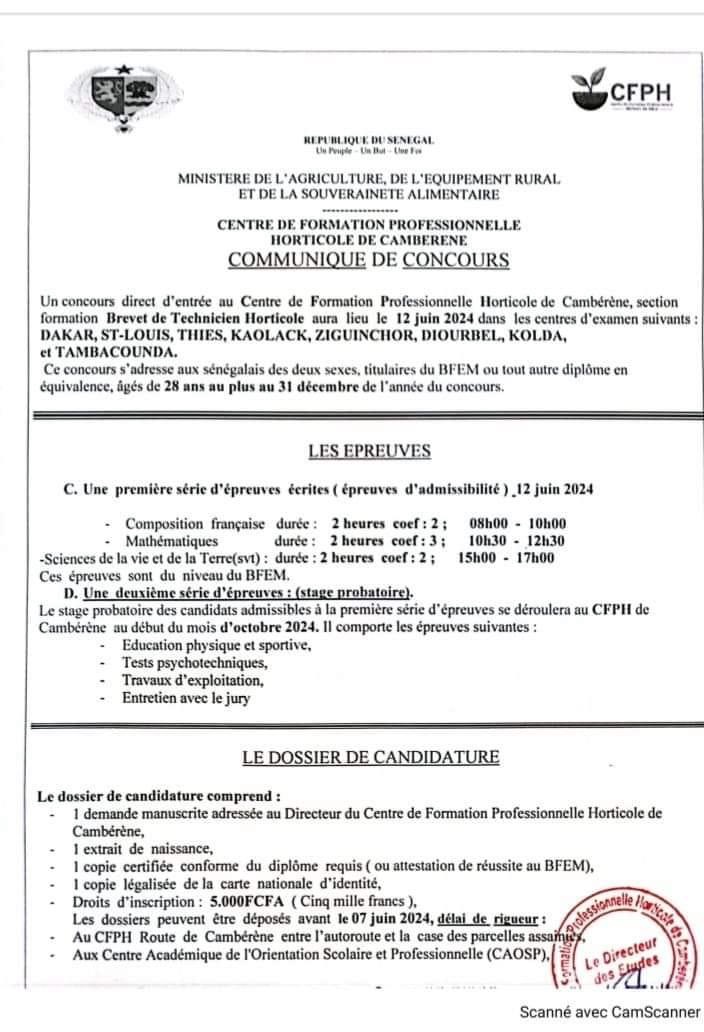 Concours d’entrée au Centre de Formation professionnelle Horticole de Camberene Niveau CAP et BT.