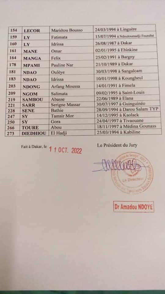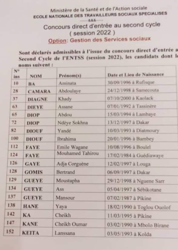 Concours ENTSS, Résultats du concours direct d’entrée au second cycle option Gestion des Services Sociaux.