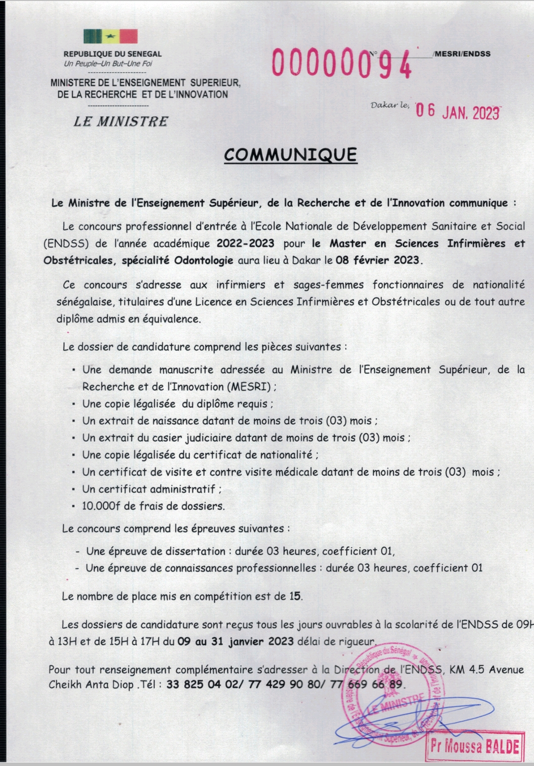 Ouverture du concours d’entrée à l’ENTSS – Session 2026