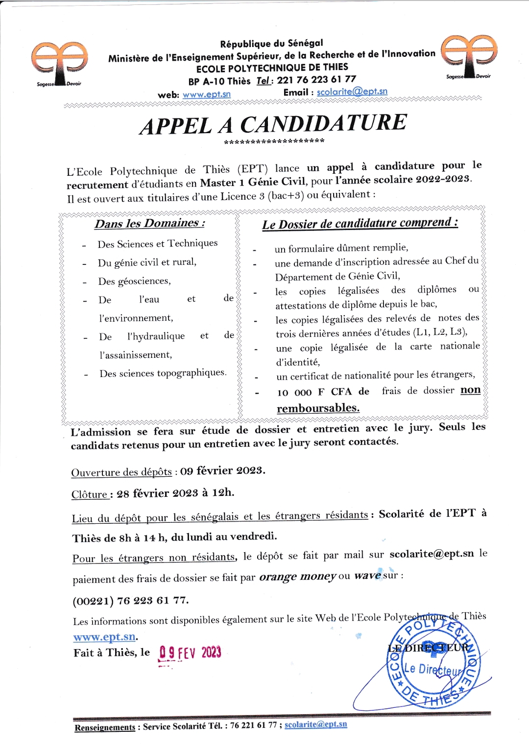 EPT lance le recrutement d’étudiants en Master 1 Génie Civil