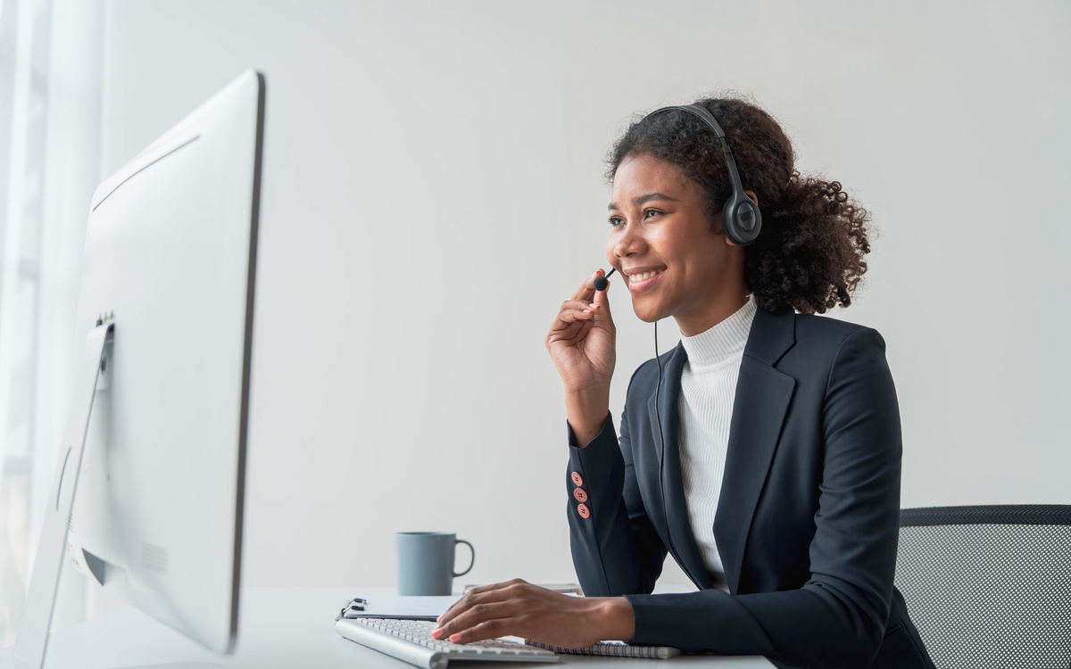 close up call center operator in wireless headset talking with customer, woman in headphones with microphone consulting client on phone in customer support service, looking at computer screen..