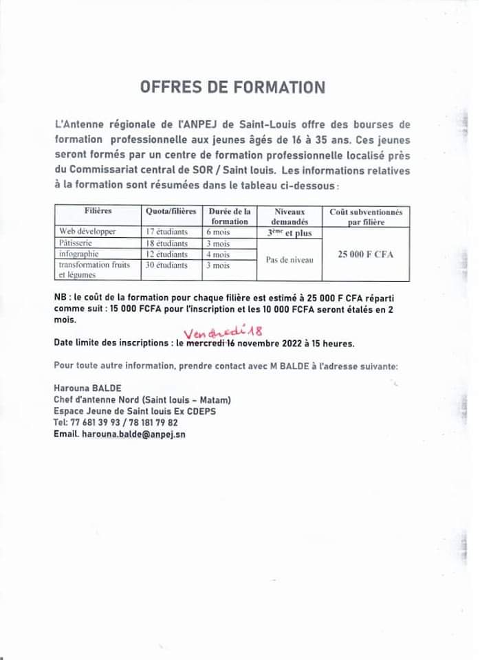 2022 - 2023 : Attestion de formation en Paludologie à l’hôtel Hobbé de Kolda du 11 au 16 décembre 2023 par le Programme National de Lutte contre le Paludisme. 2022 - 2023 : Certificat en Commerce Digital à l’Université numérique Cheikh Hamidou KANE (ex UVS) en collaboration avec la Fondation MasterCard. 2021 - 2022 : Certificat en écriture de Série / Scénariste à la Maison de la Culture Douta Seck de Dakar. 2019 - 2020 : Diplômé Assistant Infirmier d’Etat au centre régional de Formation en santé de Kolda du Ministère de la Santé et de l’Action Sociale. 2021 - 2022 : Certificat sur les mécanismes de financement, l'Éducation financière, l’élaboration d’un Business Plan et la préparation au Pitch du Programme INVEST IN AFRICA de la Fondation Mastercard. 2021 - 2022 : Attestation en Entreprenariat Privé à la Direction des Petites et Moyennes Entreprises. 2016 - 2017 : Licence 1 Biologie Chimie et Géosciences à l’Université Cheikh Anta Diop de Dakar. 2014 - 2015 : Baccalauréat S2 au Lycée Bouna Kane de Kolda. ________________________________________ 2021-2022 : Formation en Education Financière au Cabinet The Uptribe – Buntu Yokkuté –Giz. 2021-2022 : Formation sur les bases de l’infographie/Illustrator au Centre Consortium Jeunesse Sénégal de Dakar. 2020-2021 : Formation sur la Prise en charge du Paludisme de l’enfant et de la femme enceinte au Centre de Santé de Vélingara /Région Médicale de Kolda.