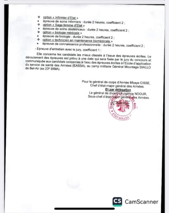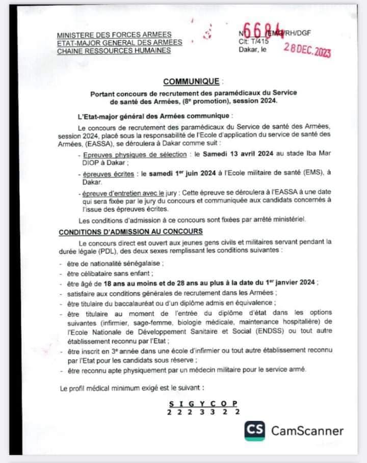 L’Etat-Major Général des Armées annonce : Le concours de recrutement des paramédicaux au Service de Santé des Armées, session 2024, sous la responsabilité de l’École d’Application du Service de Santé des Armées (EASSA), se déroulera à Dakar comme suit :