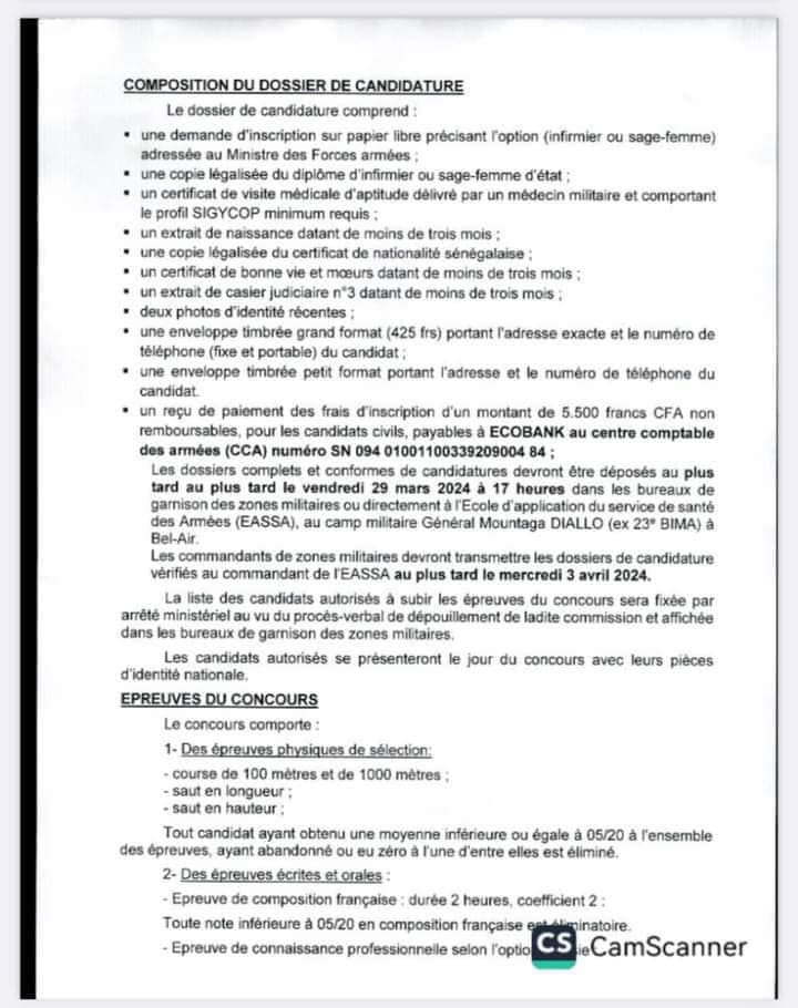 - Examens écrits le samedi 1er juin 2024, à l’Ecole Militaire de Santé (EMS), à Dakar.