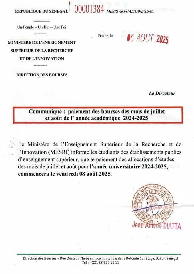 Reading: Paiement des bourses des mois de juillet et août 2025