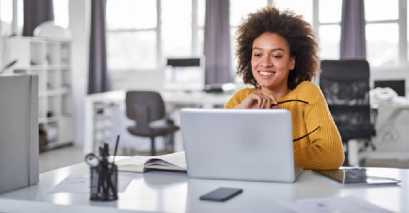 Beautiful smiling mixed race businesswoman dressed casual sitting in office and using laptop.