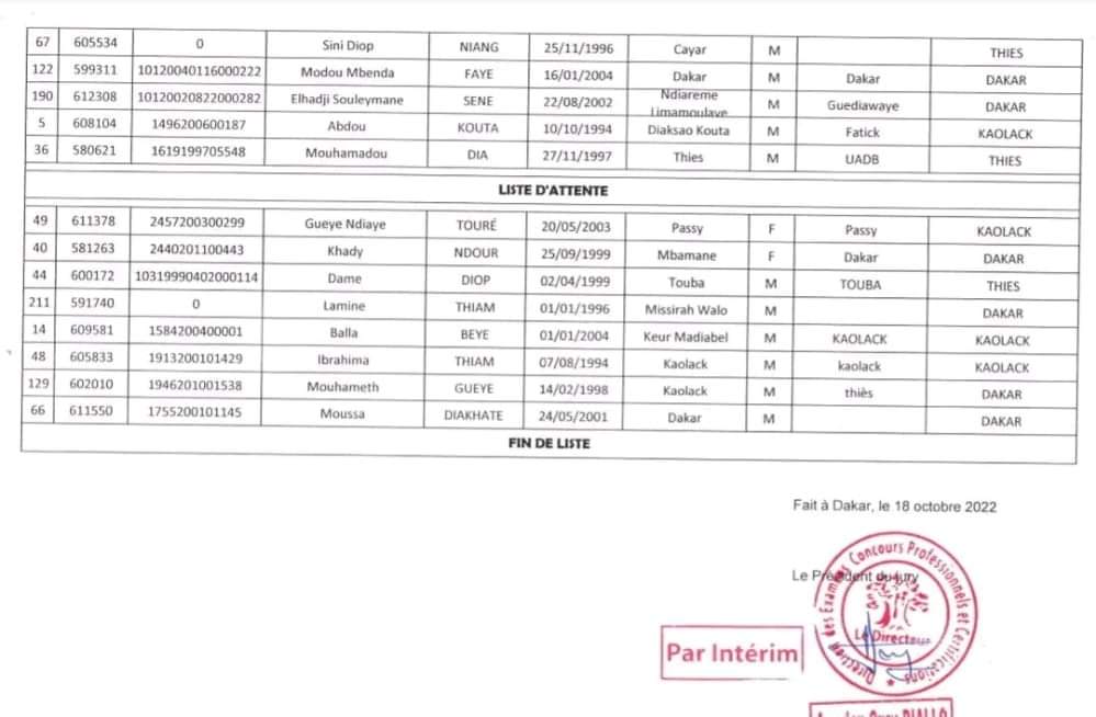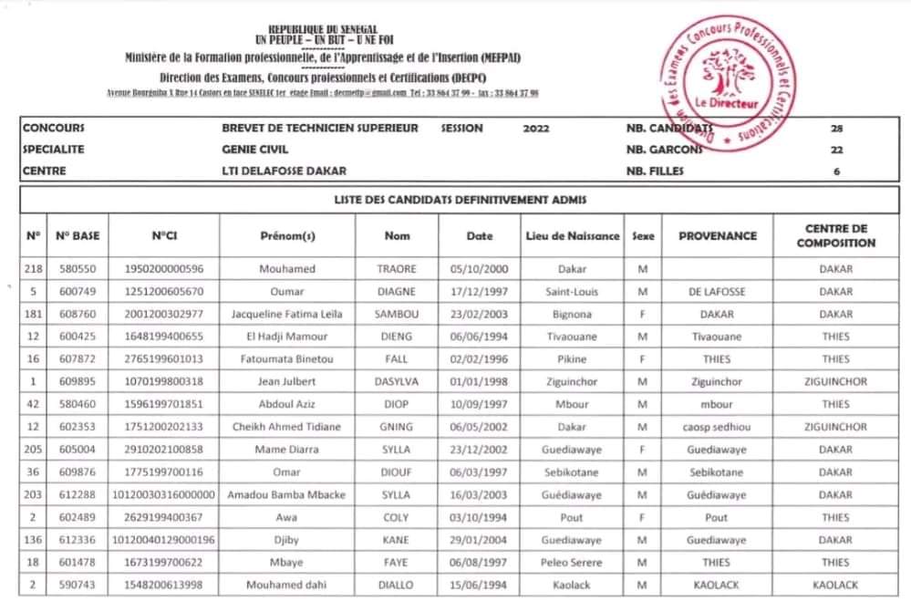 Résultats définitifs Concours BTS Génie Civil LTFXD de (THIÈS)