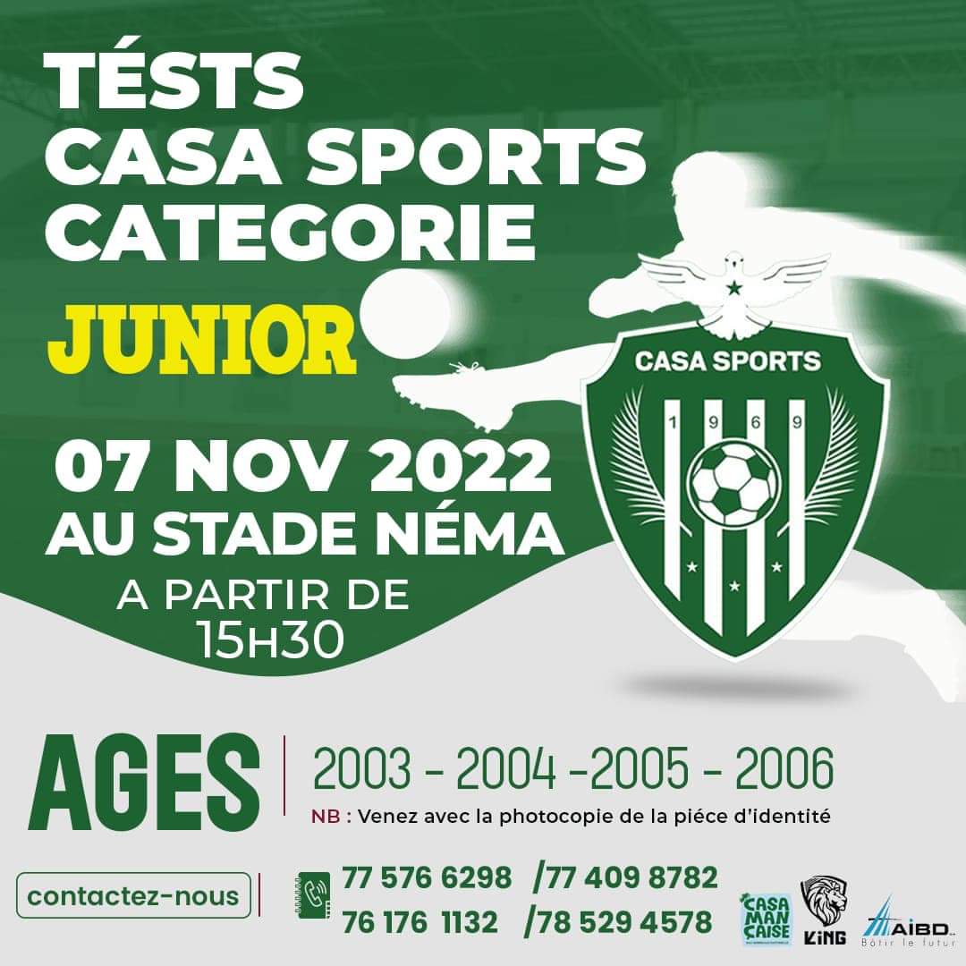Le Casa Sports vous annonce le début des tests en catégorie junior, ce lundi 7 Novembre 2022 au Stade Jules François Bocandé de Nema à partir de 15h30.