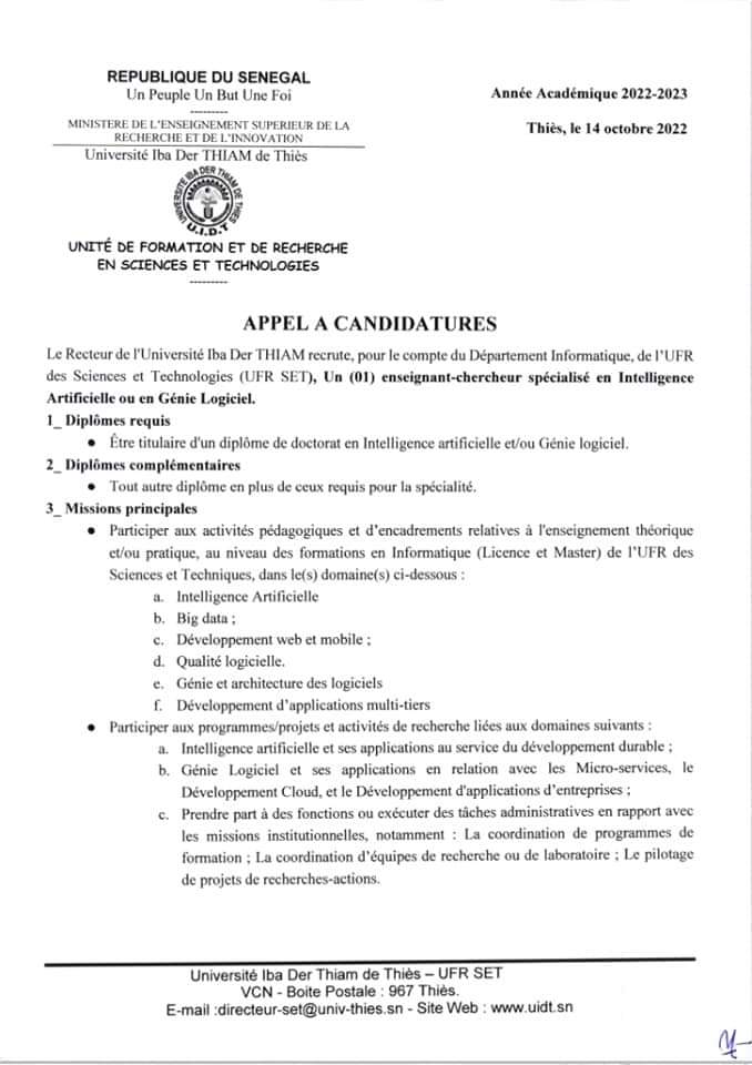 L’UFR Sciences et Technologies de l’Université Iba Der THIAM de Thiès lance un appel à candidatures pour le recrutement d’un enseignant chercheur en Intelligence Artificielle ou en Génie logiciel pour le compte de son Département Informatique.