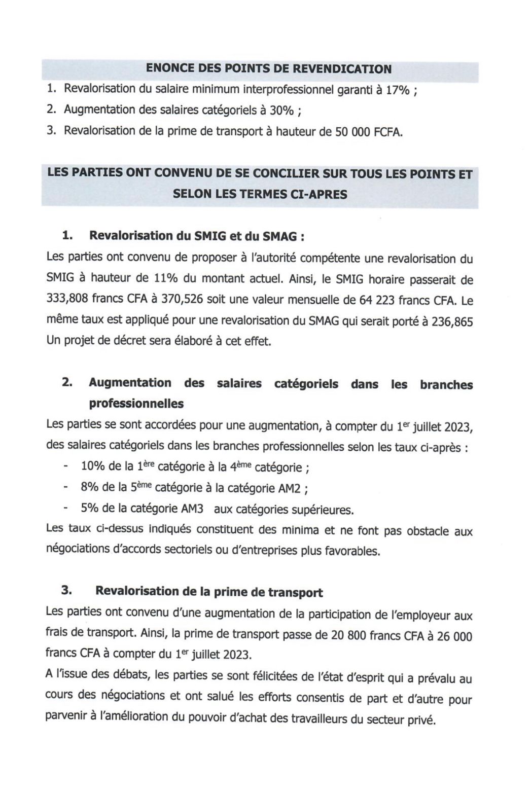 - REVALORISATION DU SMIG HORAIRE de 333,808 FCFA à 370,526 FCFA et du SMAG HORAIRE de 213,392 FCFA à 236,865 FCFA, soit une augmentation à hauteur de 11 %. Cette revalorisation ne sera effective qu’après la signature du décret y afférent.